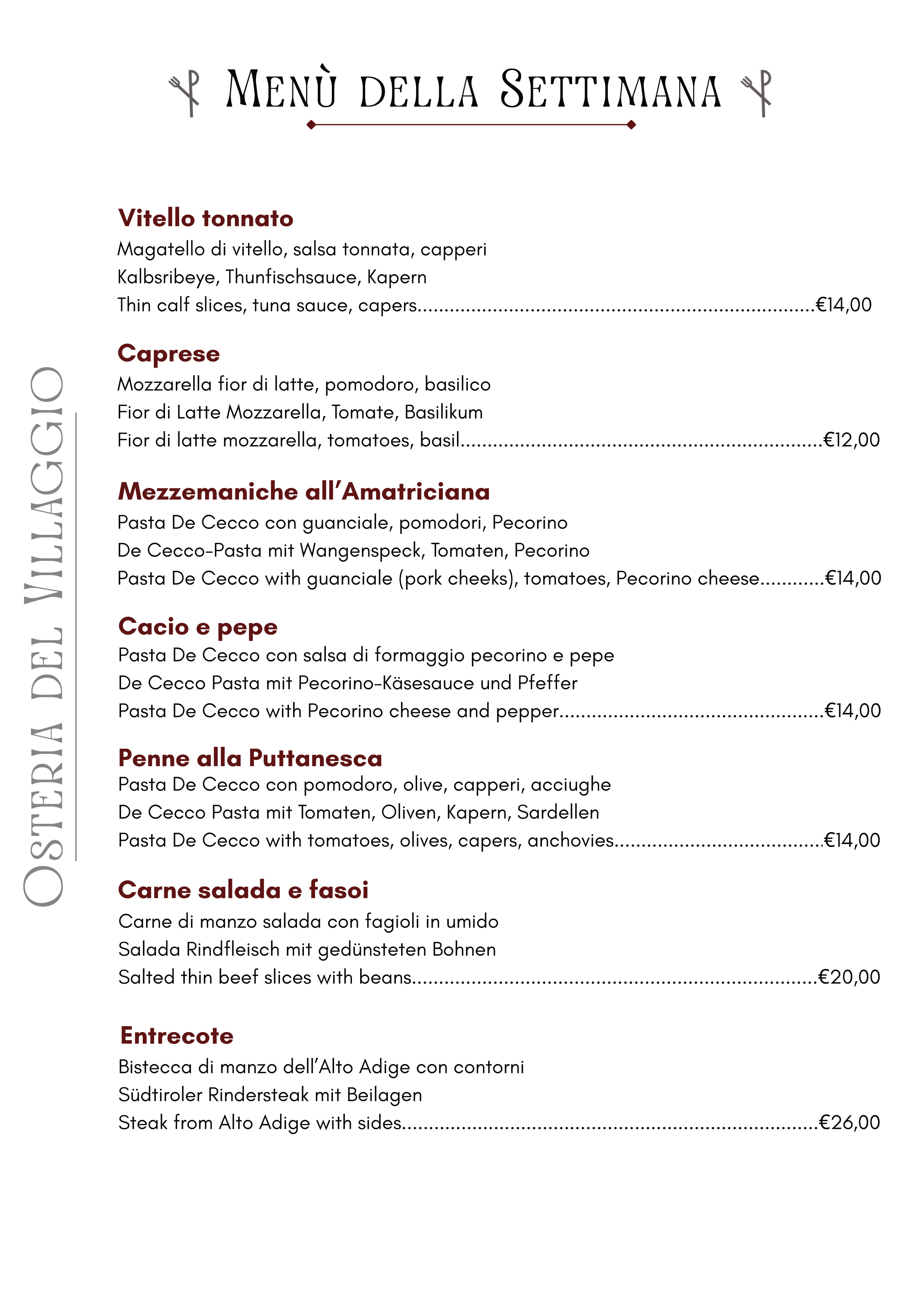 CALL +393459144204Il nostro ristorante osteria situato a Merano (nella frazione di Sinigo) è specializzato in piatti tipici della tradizione culinaria italiana. Amatriciana, Carbonara, Risotti, Carne salada, solo alcuni esempi. Il Winebar offre una ricca selezione di vini locali e nazionali, bianchi secchi, bollicine, fino ai vini rossi.